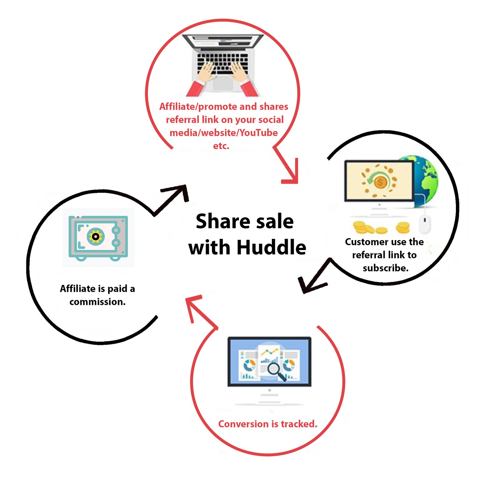 - You can share Huddle Day services online with your followers and offline with your network by sharing the referral link that pre-set up in your account and earn money on qualifying subscription for paid plans.